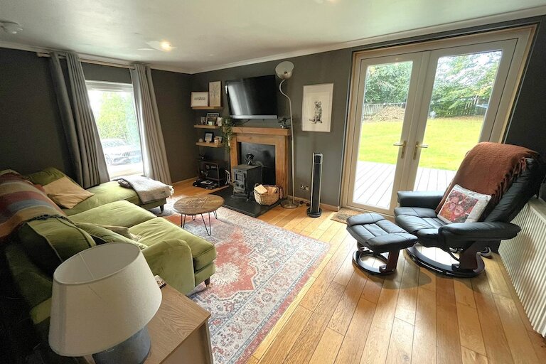 French doors lead out to the garden, window to front, inset ceiling spotlights, solid oak flooring, fireplace with wood burning stove.