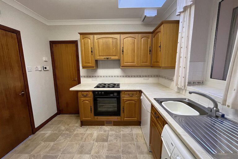 Window looking into sitting room, sky light, fitted kitchen in wood effect, built-in single electric oven, hob & hood, plumbing & space for washing machine & dishwasher, built-in shelved larder, built-in storage cupboard, vinyl flooring, ceiling strip light.