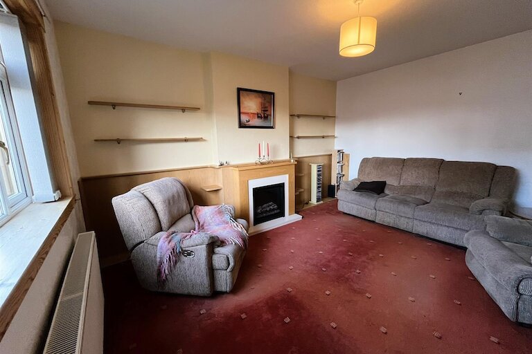 Window to front; fixed feature fireplace with electric fire; fitted carpet; ceiling light fitting.