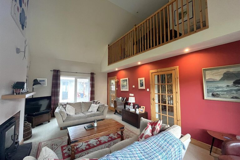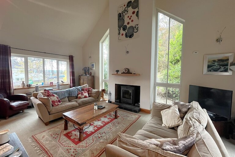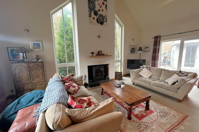 Triple aspect to front, side and rear; vaulted ceiling; inset ceiling spotlights; three wall light fittings; recessed wood burner; fitted carpet; Patio doors lead to the rear garden.