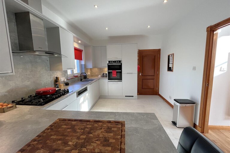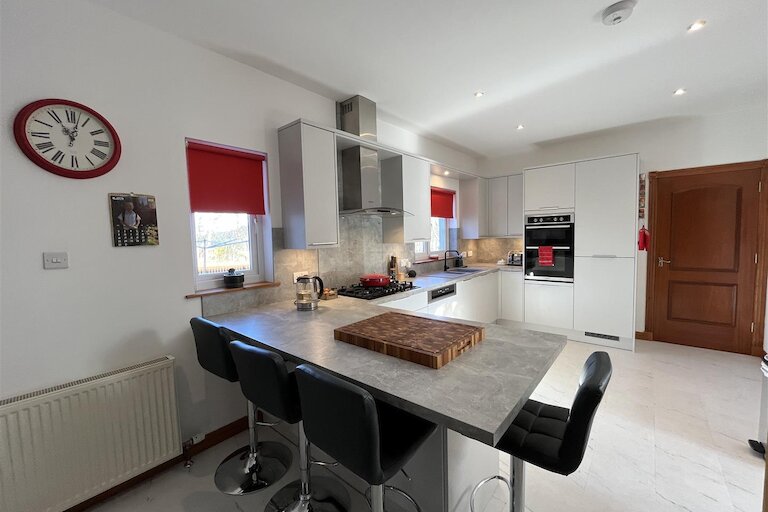 Two windows to rear, recently fitted kitchen in grey, built-in double electric oven, 5 ring gas hob & hood integrated dishwasher & fridge freezer, tile effect flooring, inset ceiling spotlights.