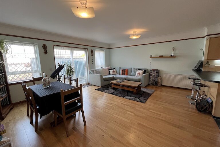 Windows & Patio doors to the rear garden, wood effect flooring, two ceiling light fittings.