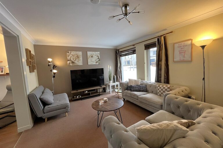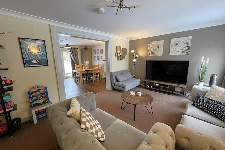 The garden to the front has an area of lawn & a driveway provides off-street parking for two cars, EV charging point. The fully enclosed rear garden is mainly lawn with a raised area of decking, three wooden garden sheds.