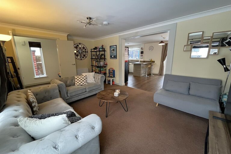 Window to front, open plan to dining kitchen, fitted carpet, ceiling light fitting.