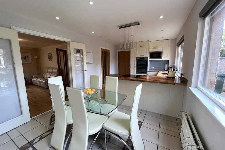 Two windows to rear; fitted ktichen in cream; built-in double electric oven; microwave and induction hob; integrated dishwasher; dining space for family size dining table and chairs; wood effect and ceramic tile flooring; ceiling light fitting; inset ceiling spotlights.