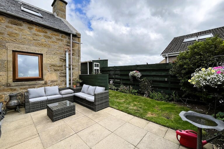 The rear garden is also lawn with two patio areas and mature planted borders.