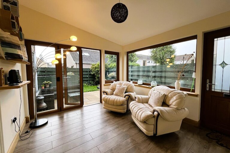Glazed on two sides with door to the side and bi-fold door to the rear; wood effect flooring; ceiling light fitting.