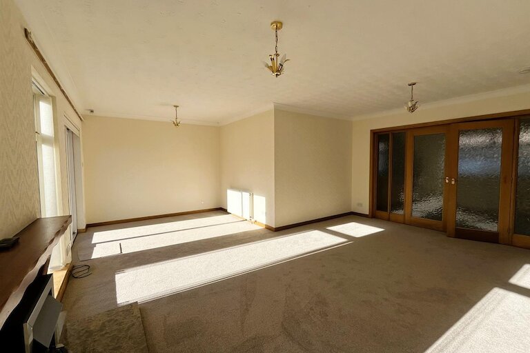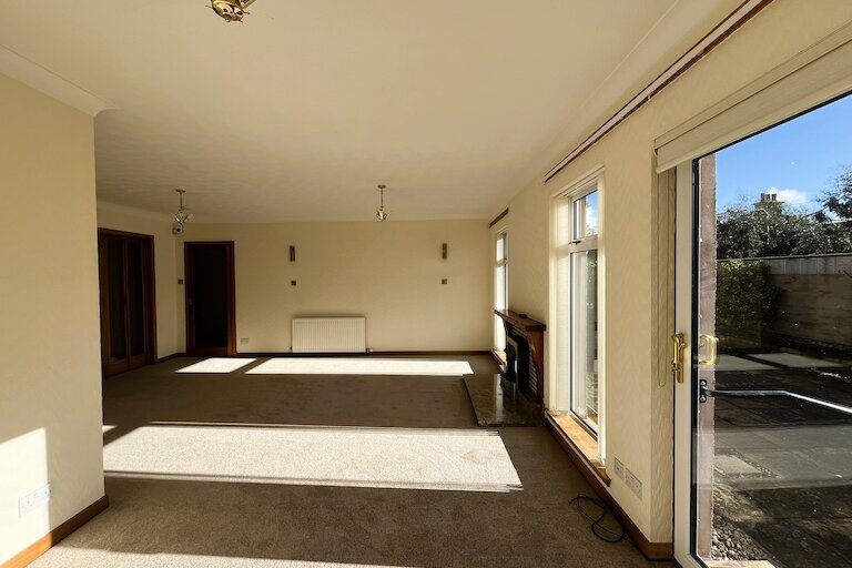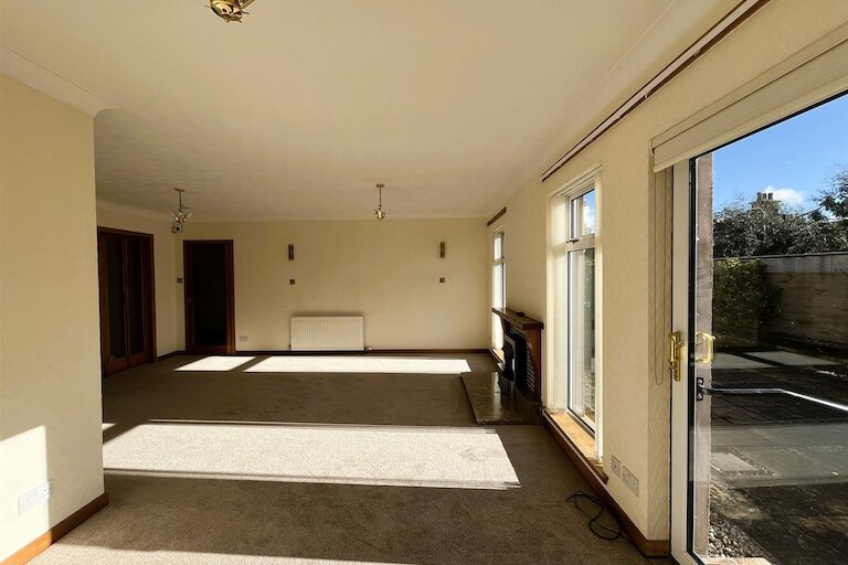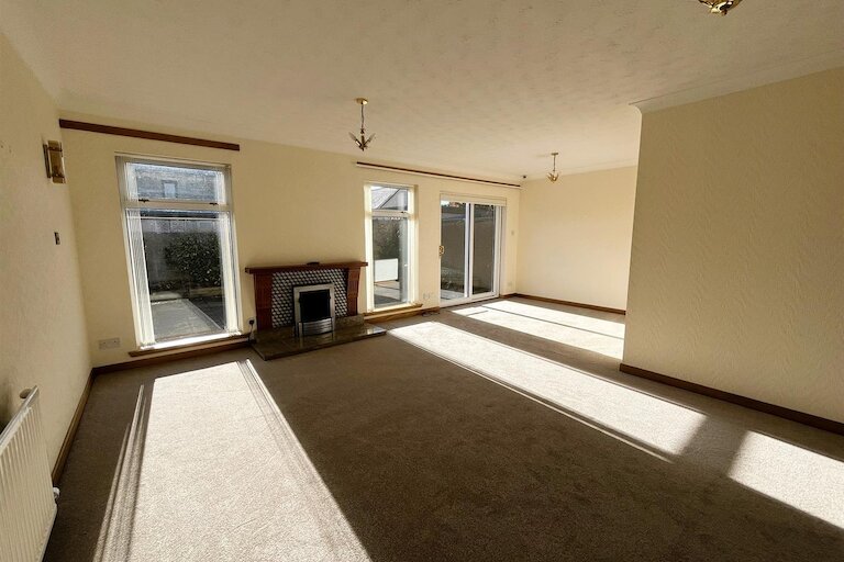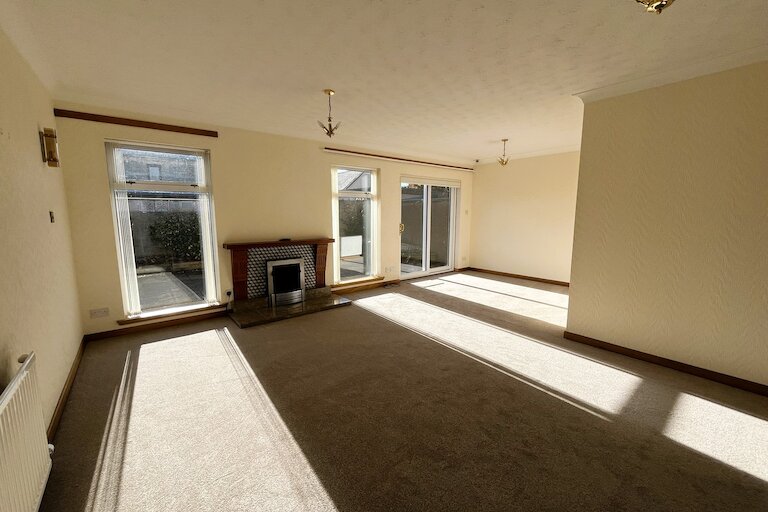 Two windows & patio doors to the rear garden, feature fire place with electric fire, fitted carpet, three ceiling light fittings & two wall light fittings.