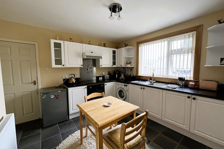 Window to rear; fitted kitchen in white; built-in single electric oven, hob and hood; plumbed in washing machine; tile effect flooring; ceiling light fitting; built-in storage cupboard.