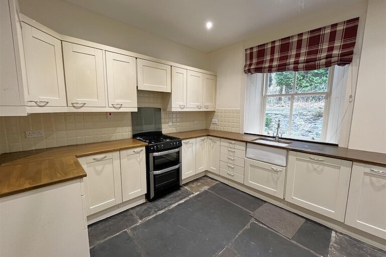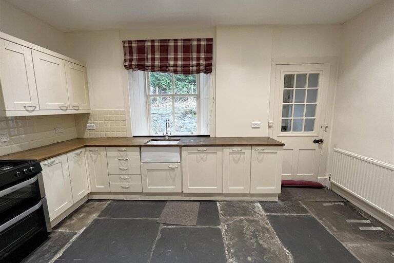 Window to rear, fitted kitchen in cream, Belfast sink, slot-in gas cooker, integrated dishwasher, ceiling pulley, flagstone floor, inset ceiling spotlights.